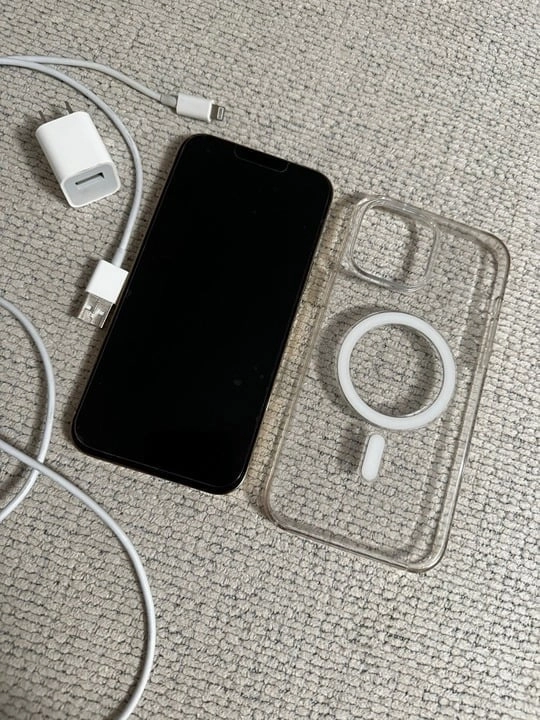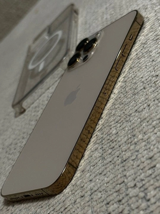Includes – iPhone 13 Pro Max Gold, Apple Charging, Apple Wire, iPhone 13 Pro Clear Case with MagSafe.